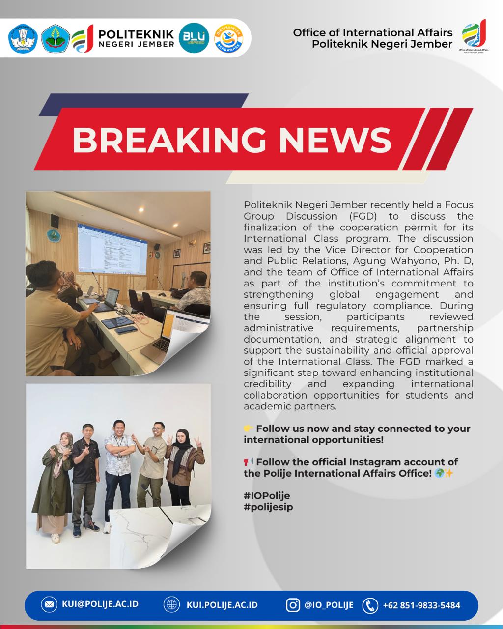 Politeknik Negeri Jember recently conducted a Focus Group Discussion (FGD) to discuss the finalization of the cooperation permit required for the implementation of its Internationa...