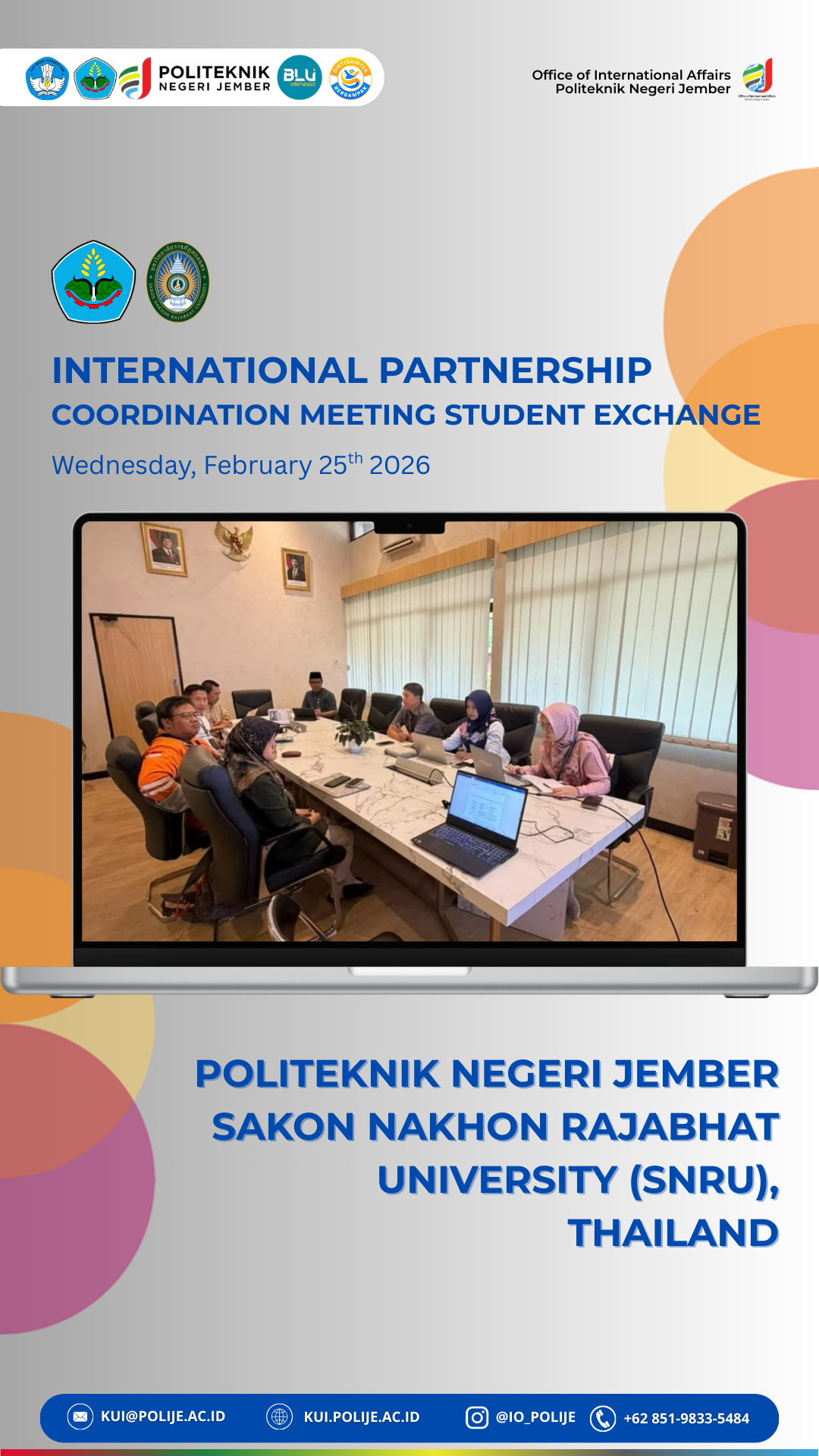 The Office of International Affairs of Politeknik Negeri Jember (POLIJE) organized an International Partnership Coordination Meeting on Student Exchange with Sakon Nakhon Rajabhat University (SNRU), Thailand, on Wednesday, February 25th, 2026. The meeting was conducted as part of ongoing efforts to strengthen academic collaboration and enhance student mobility between the two institutions.